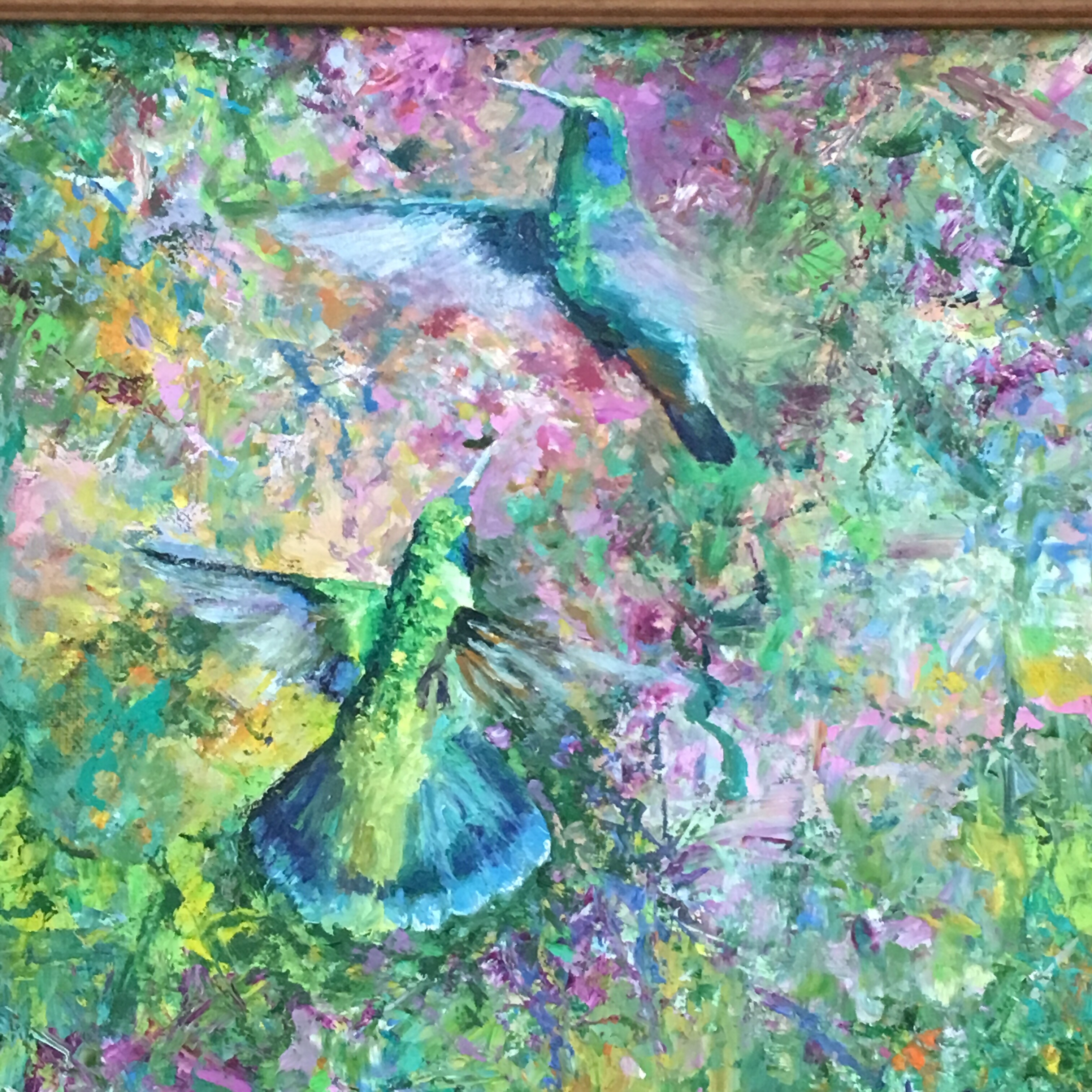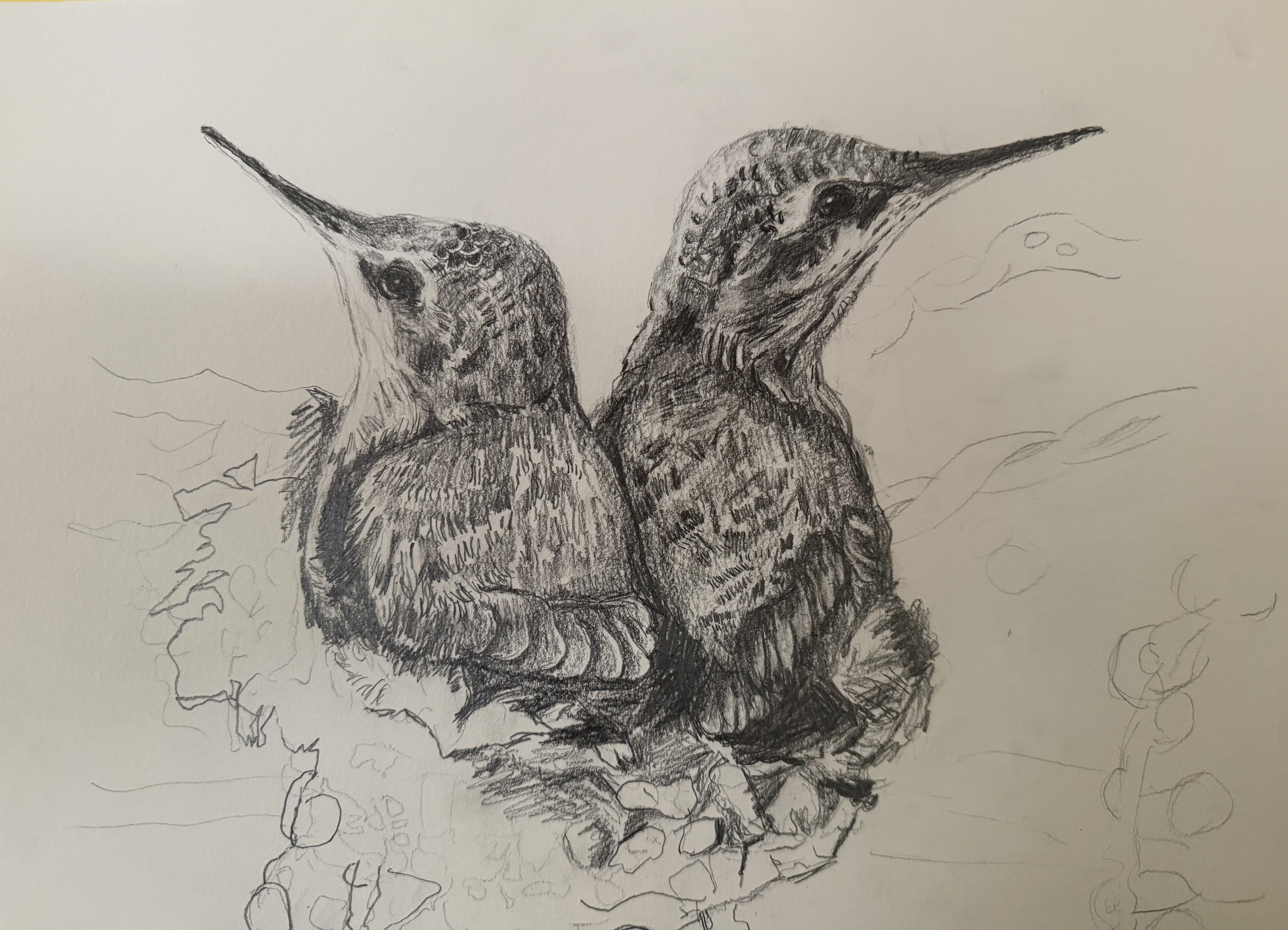 I'm Jean Saris and I was born and raised in Allouez, Wisconsin, an unincorporated township just outside Green Bay. We lived among the cow fields and woods. I have always liked drawing and painting. One of my earliest drawings was a robin's nest in a boxelder tree just outside my bedroom window. I've always been interested in wildlife, and although I have lived in many places, including the Netherlands, I now reside in California. I planted native trees and plants over the course of a decade, attracting more than two dozen different species of birds who stop for water and food, but also to nest and raise their young in the trees and bird houses erected on the property. One nest that I did not expect was a hummingbird nest that was build on a string of patio lights. I watched the two chicks for a month taking photographs everyday as they grew. The last photo I would take was the day they fledged.