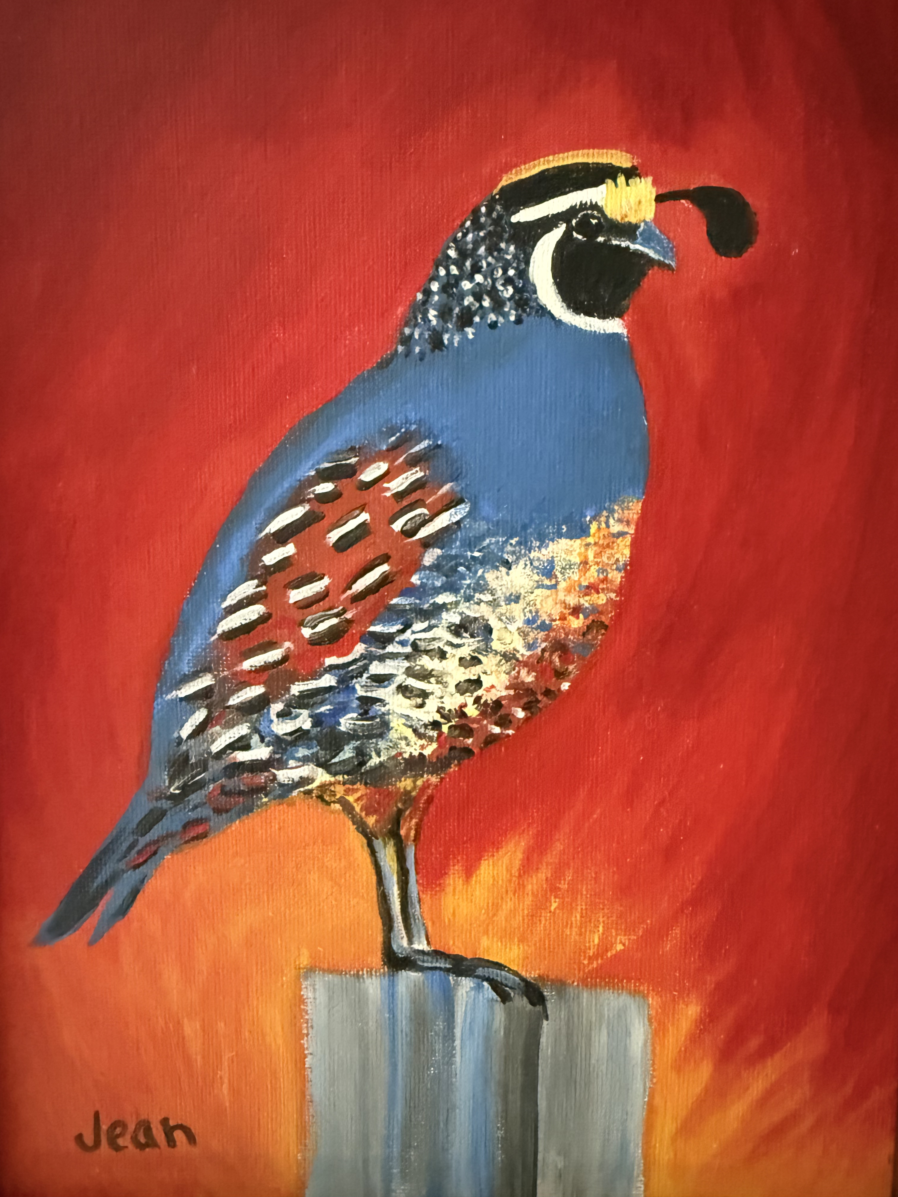 Jean Saris is a Wisconsin native living in California with her husband and daughter. She is a teacher, filmmaker, and artist. Her passions are drawing and painting, gardening, and birth watching. She is a member of the Congo Valley Audubon Society and Westlake Village Art Guild.